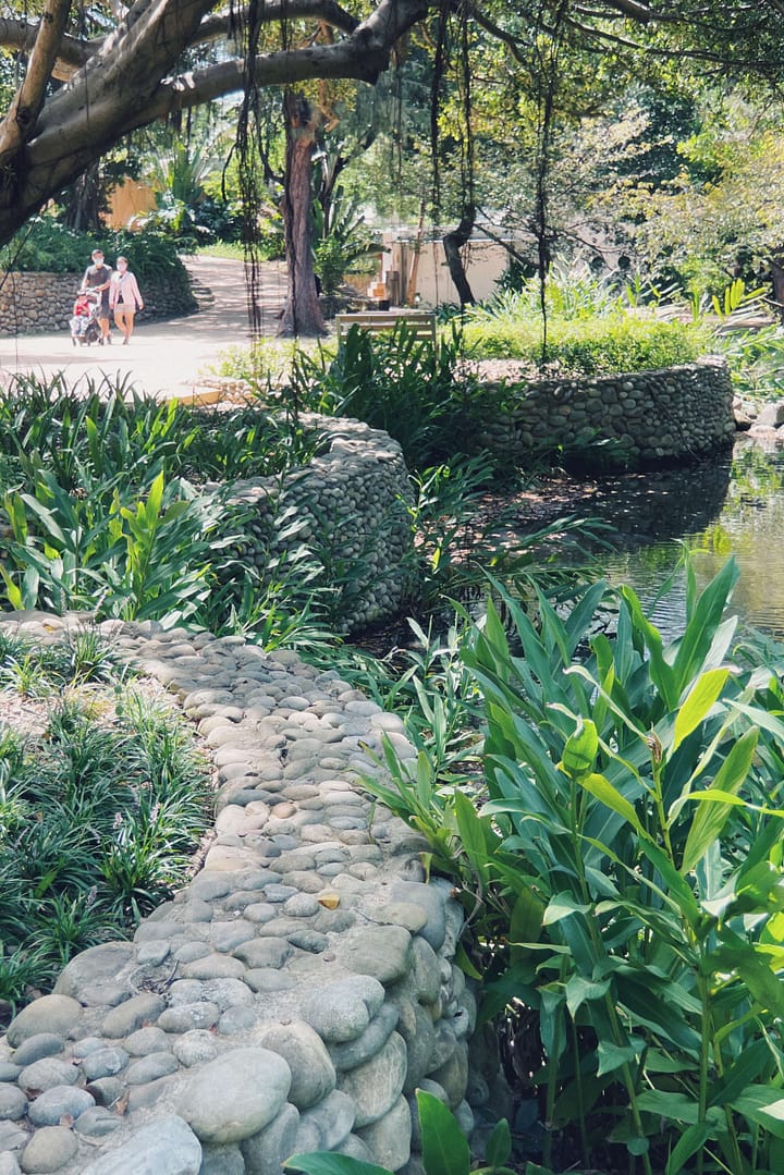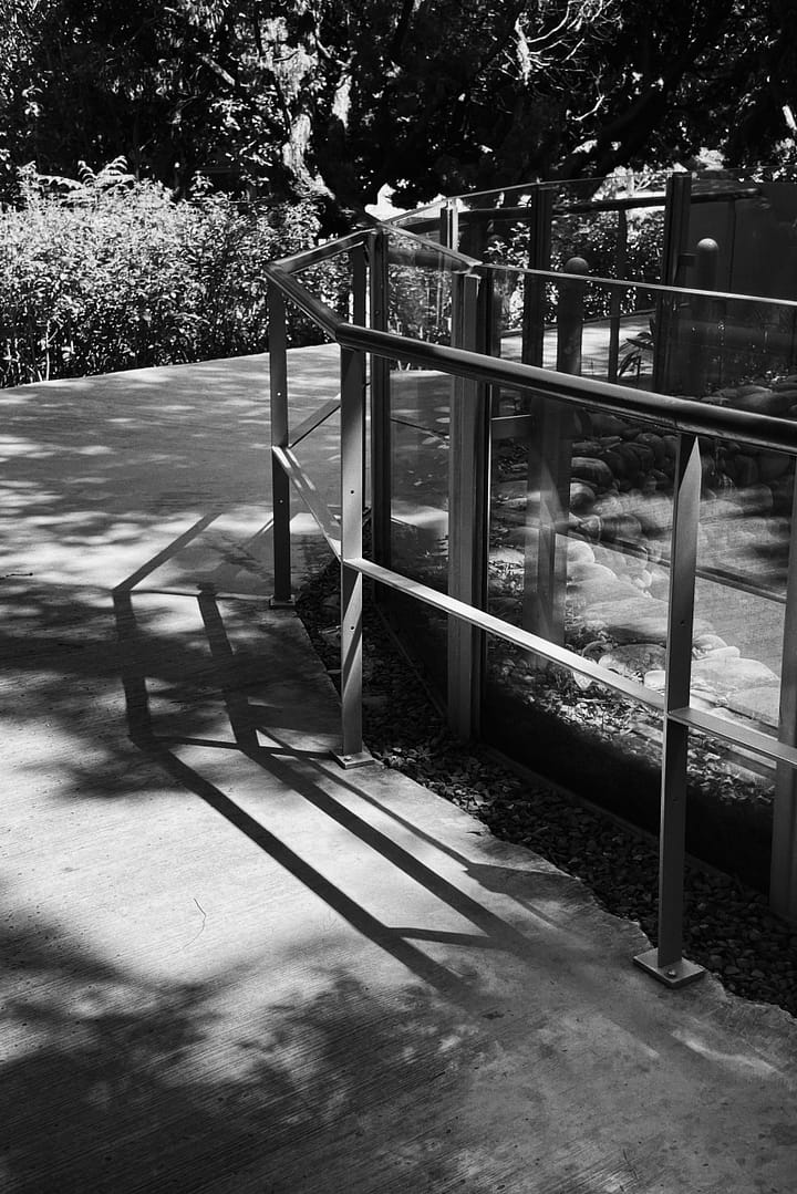 Once visitors pass through the first interface, X1, they will reach the zoo from the crossing to arrive at the center plaza. The evenly spaced wooden poles are used to define the plaza and to separate the urban habitat and the natural landscape. The wooden poles appear as the walls that cage visitors. Through the wood-post walls, one hears the roars and yelps and occasionally gets a whiff of the odors from the animals. The concrete pavement changes to an orange hue, when one crosses through the wood-post wall. It is a subtle indication of exiting the domain of man and entering the realm of the animals.